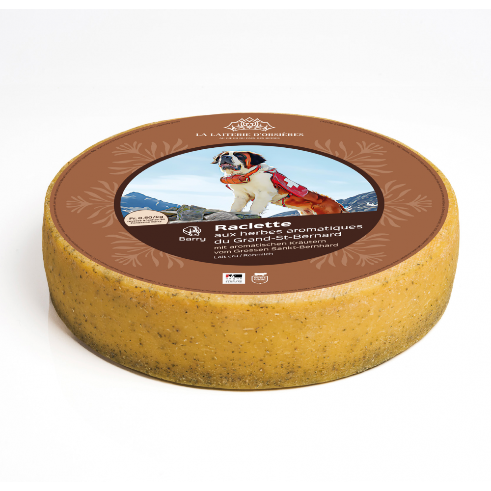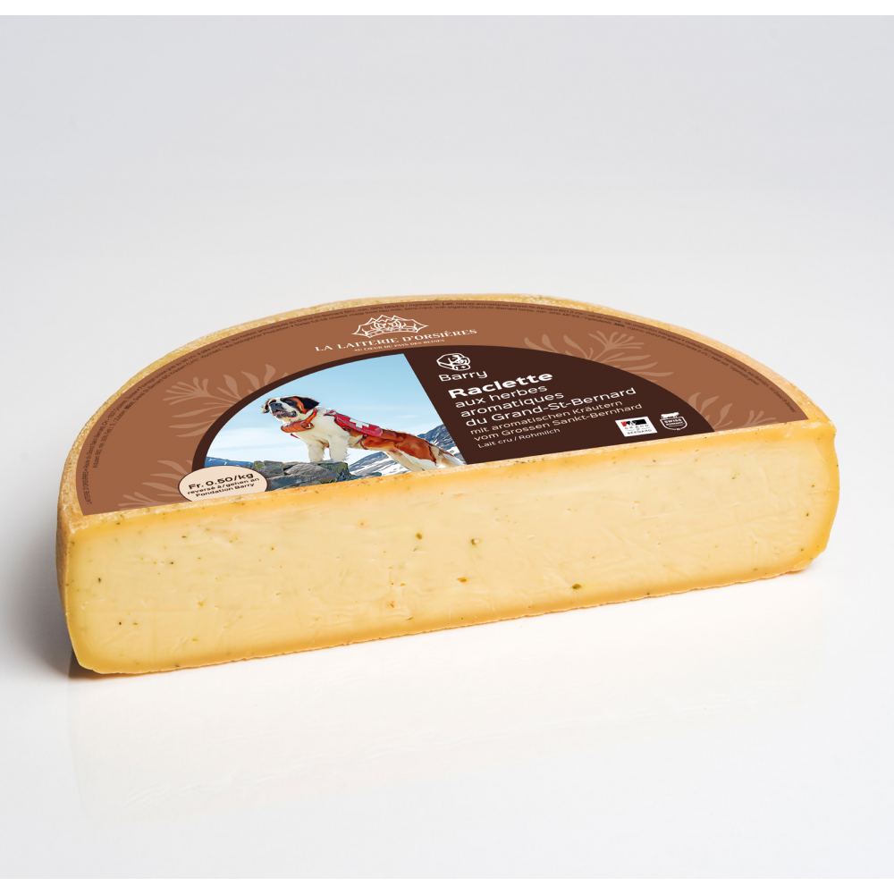 Maak kennis met de Raclette “Barry”, een unieke rauwmelkse raclette met kruiden uit de Zwitserse Alpen. Deze kaas is vernoemd naar de beroemde reddingshond Barry en brengt dezelfde warmte en kracht naar tafel: een volle, kruidige raclettebeleving die traditie en karakter combineert.